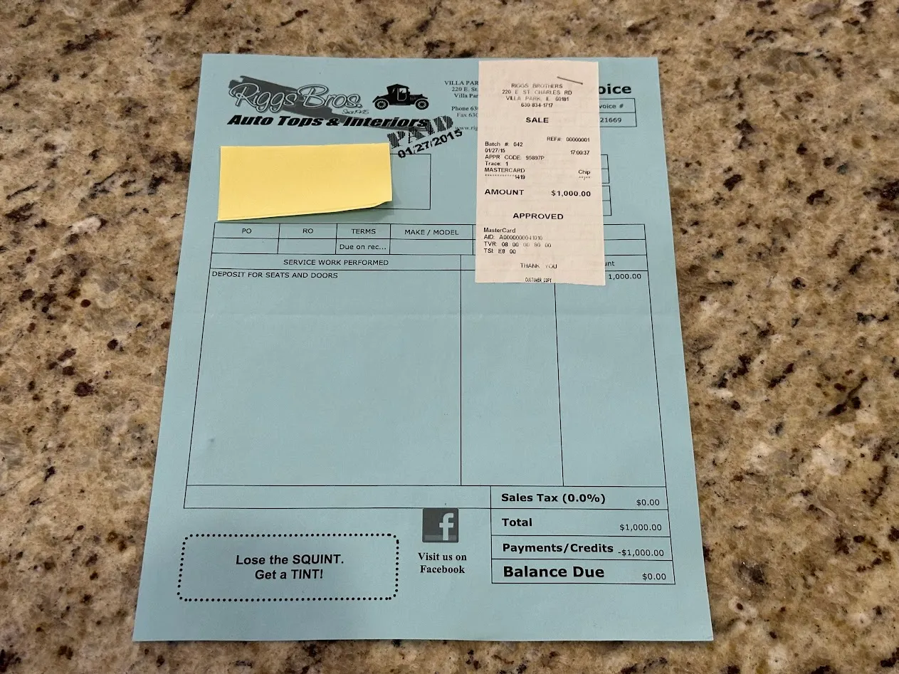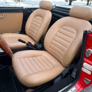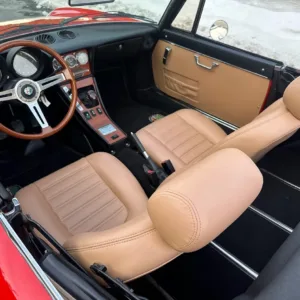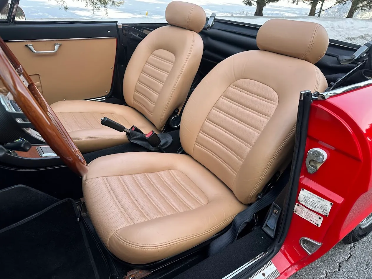 The bucket seats were retrimmed in 2015 in Biscuit leather contrasted by a restored black dashboard and replacement black carpets. Appointments include a cabin heater, a wood shift knob, and power windows.