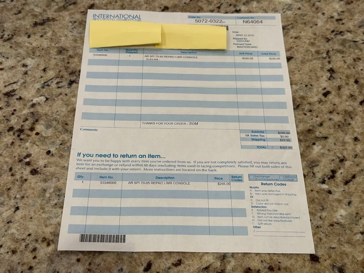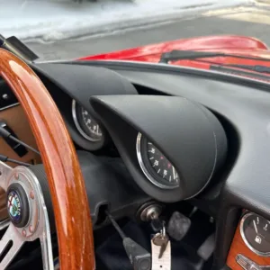 The wood-rimmed VG Hellebore steering wheel frames a Jaeger 8k-rpm tachometer and a replacement 85-mph speedometer. Auxiliary gauges for fuel level, oil pressure, and coolant temperature are housed in the center stack. The replacement six-digit odometer shows 50k miles, less than 1k of which were added under current ownership.