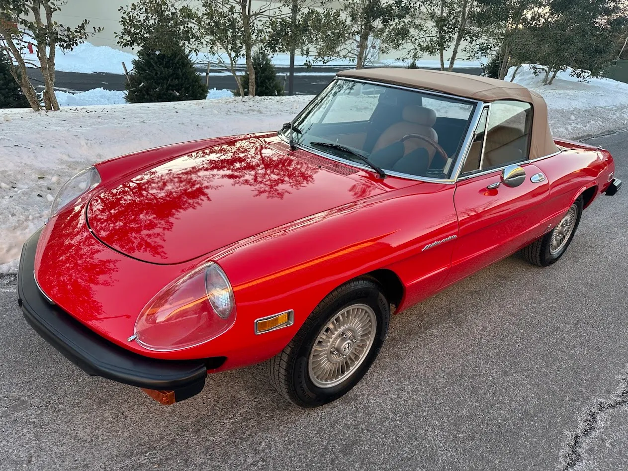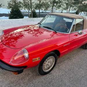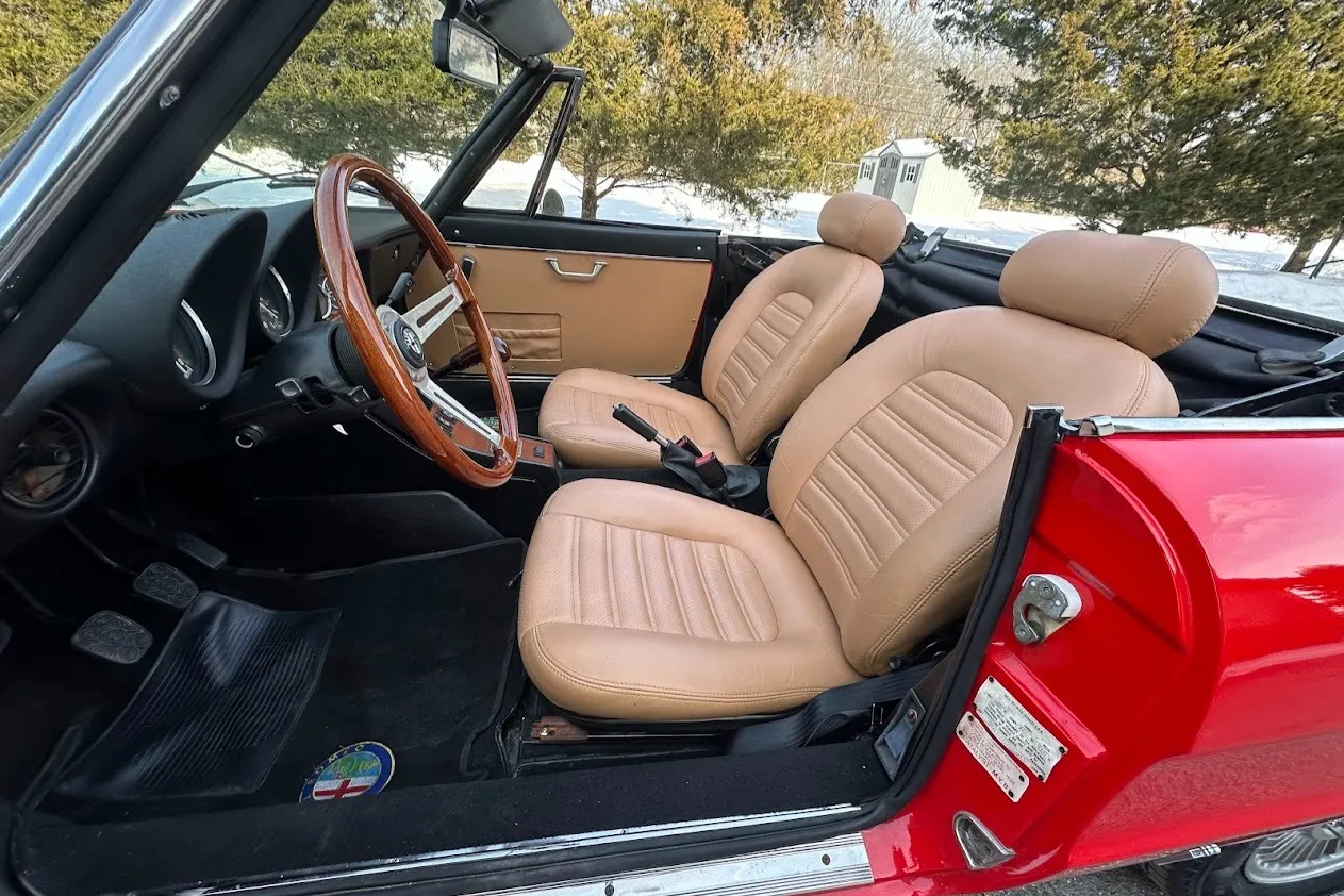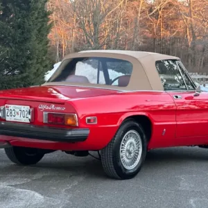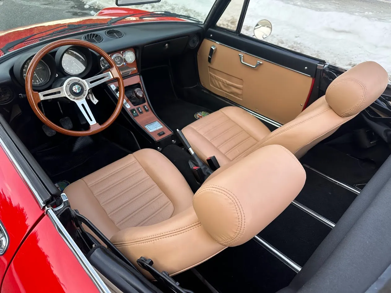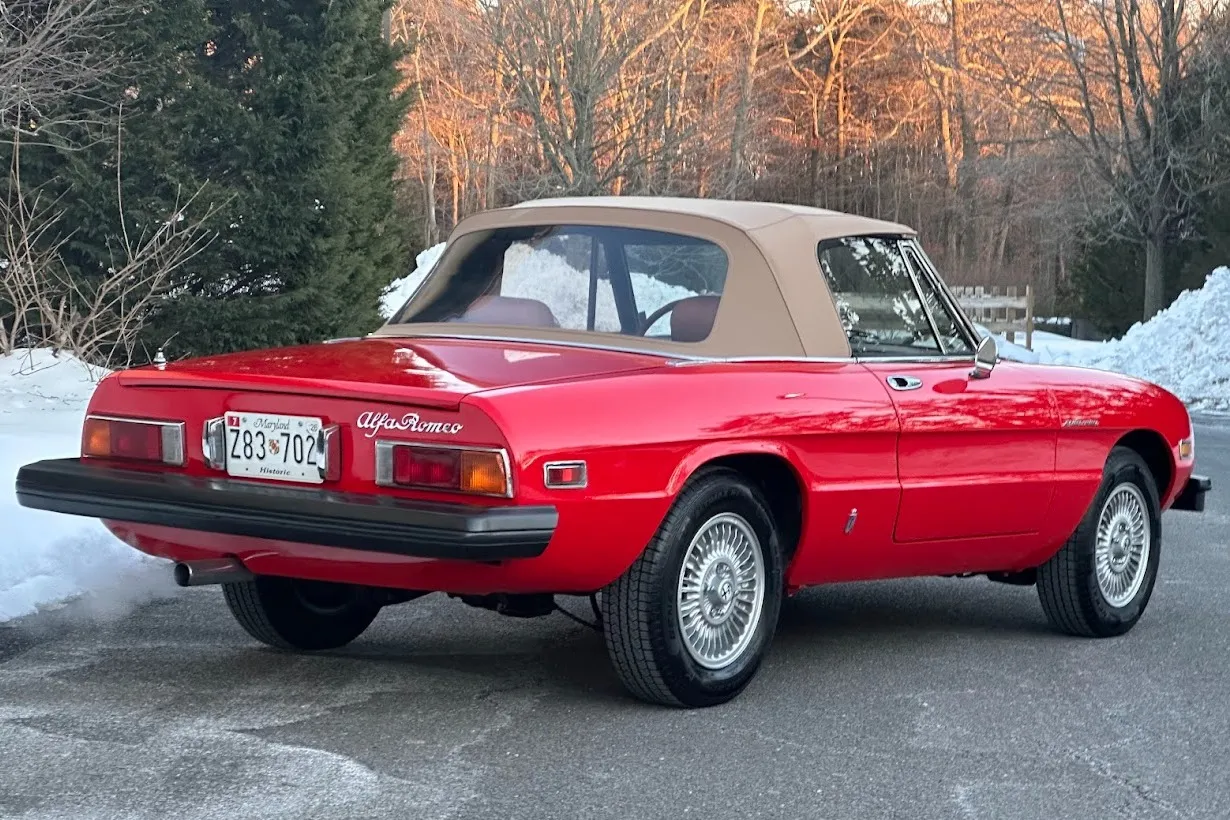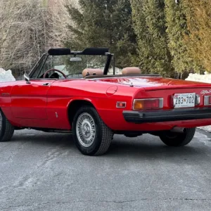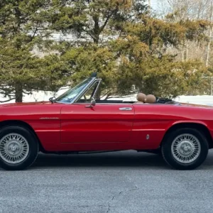 This 1981 Alfa Romeo 2000 Spider Veloce underwent a multi-year refurbishment under previous ownership and was acquired by the current owner in 2015. Finished in Rosso over Biscuit leather, the car is powered by a 2.0L twin-cam inline-four linked to a five-speed manual transmission and a limited-slip differential. Equipment includes a tan soft top as well as SPICA mechanical fuel injection, a Darstan tubular header, a Magnaflow muffler, KYB dampers, disc brakes, 14″ Campagnolo magnesium wheels, headlight covers, black bumpers, a cabin heater, a VG Hellebore steering wheel, and power windows. This Spider is offered at no reserve on dealer consignment in New Jersey with parts and service invoices and a clean Maryland title.