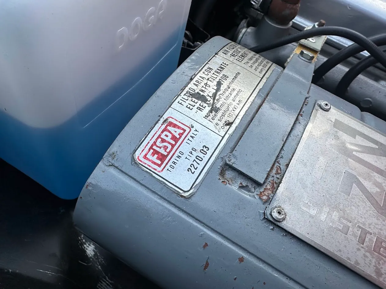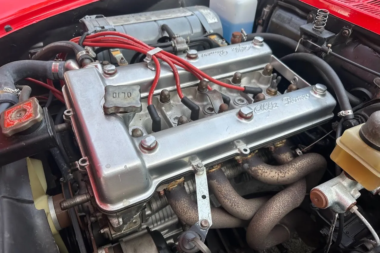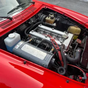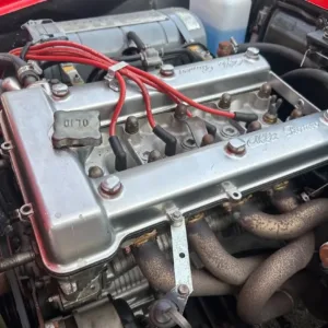 The rebuilt 2.0L twin-cam inline-four was factory rated at 111 horsepower and 116 lb-ft of torque and features SPICA mechanical fuel injection, a Darstan long-tube header, and a custom exhaust with a Magnaflow muffler. Service since 2024 included changing the oil and replacing a fuel line as well as the ignition coil and spark plugs. The factory catalytic converter has been removed.