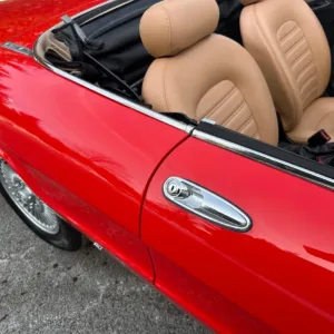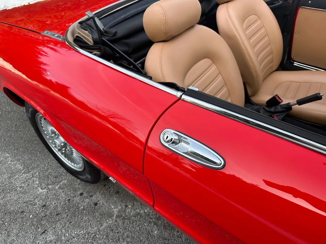 The Pininfarina-designed bodywork was refinished under previous ownership in Rosso (538) and features a replacement tan soft top. Exterior details include headlight covers, dual side mirrors, black bumpers, and a central exhaust outlet with a polished finisher.