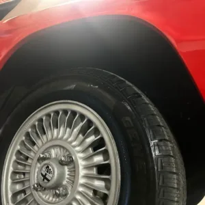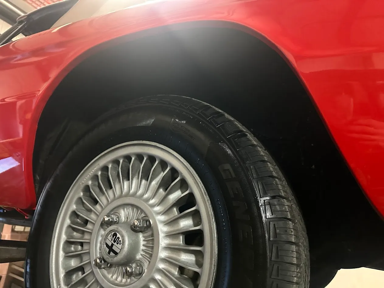 The 14″ Campagnolo Campanatura 38 magnesium alloy wheels are mounted with General Ulitmax tires manufactured in 2025. The car is equipped with an independent front suspension, a live rear axle, anti-roll bars, and KYB dampers. Braking is provided by power-assisted four-wheel discs.