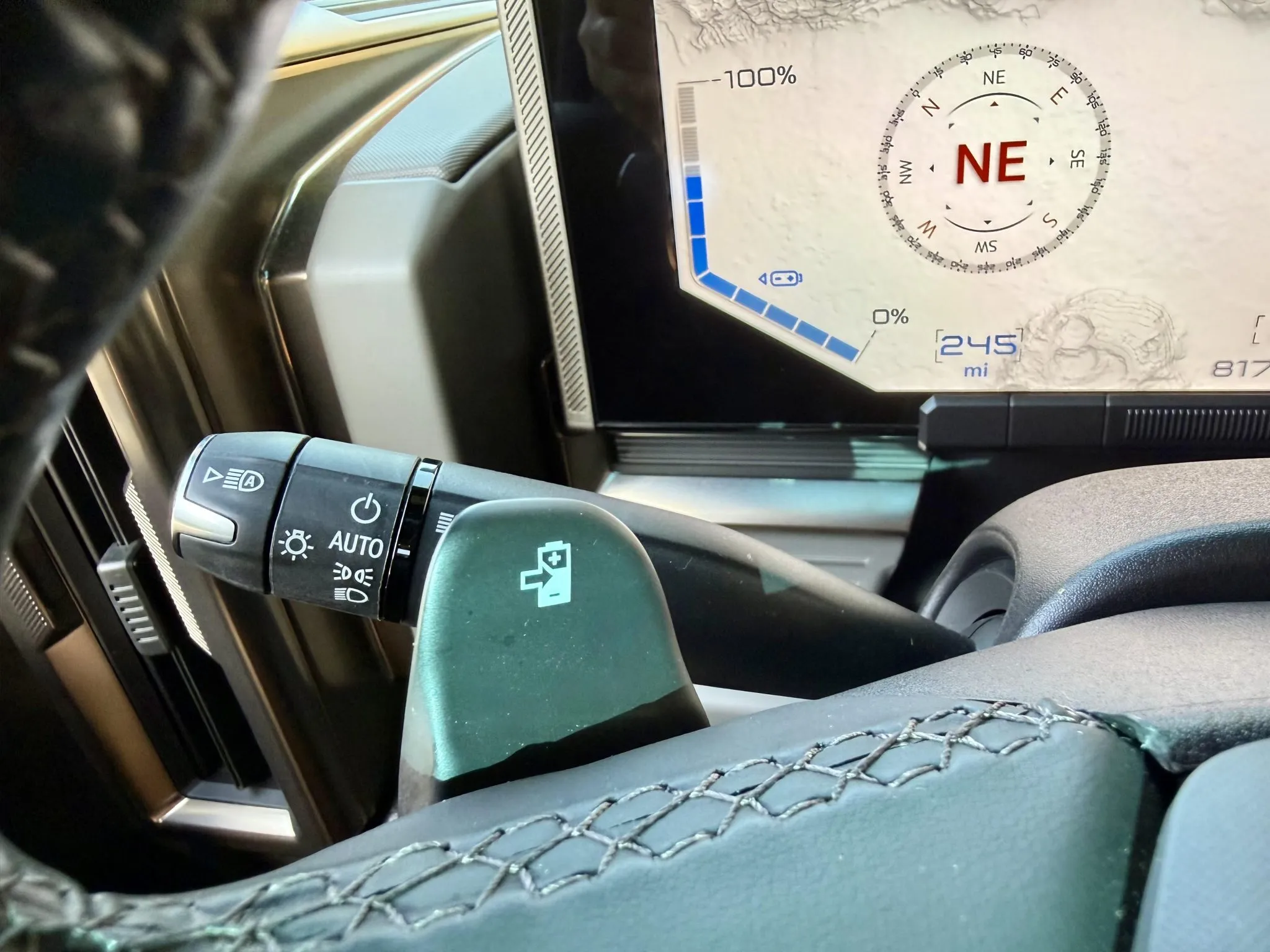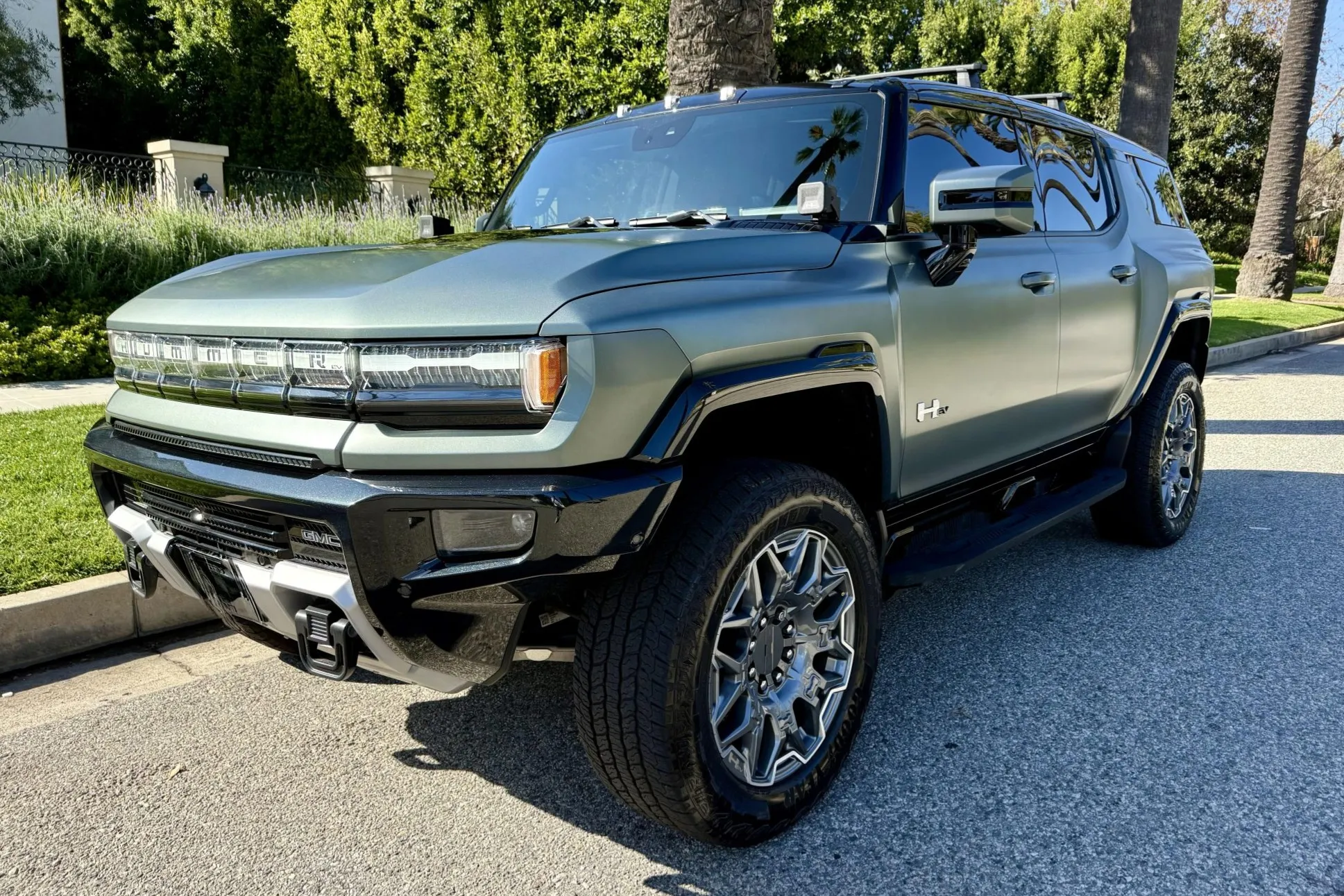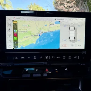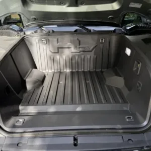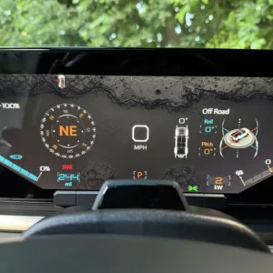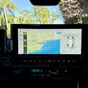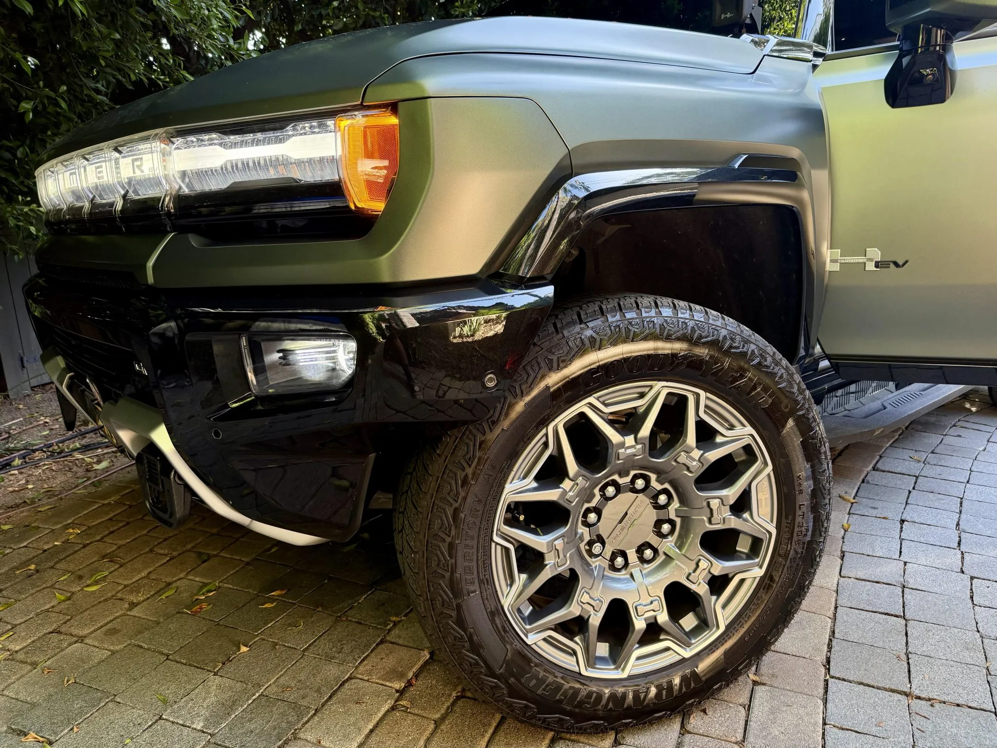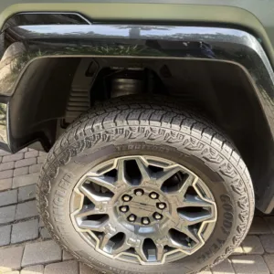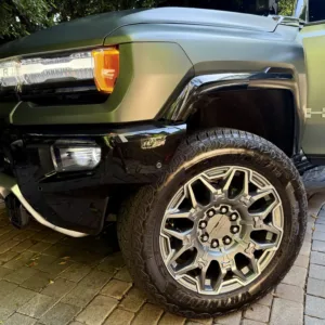 The 22″ eight Y-spoke alloy wheels are mounted with 305/55 Goodyear Wrangler Territory AT tires, and a matching spare is secured to the swing-out tailgate. The CrabWalk four-wheel steering system allows the rear wheels to turn up to 10°, enabling the truck to travel diagonally at low speeds. Additional features include regenerative braking and a four-wheel adaptive air suspension.