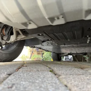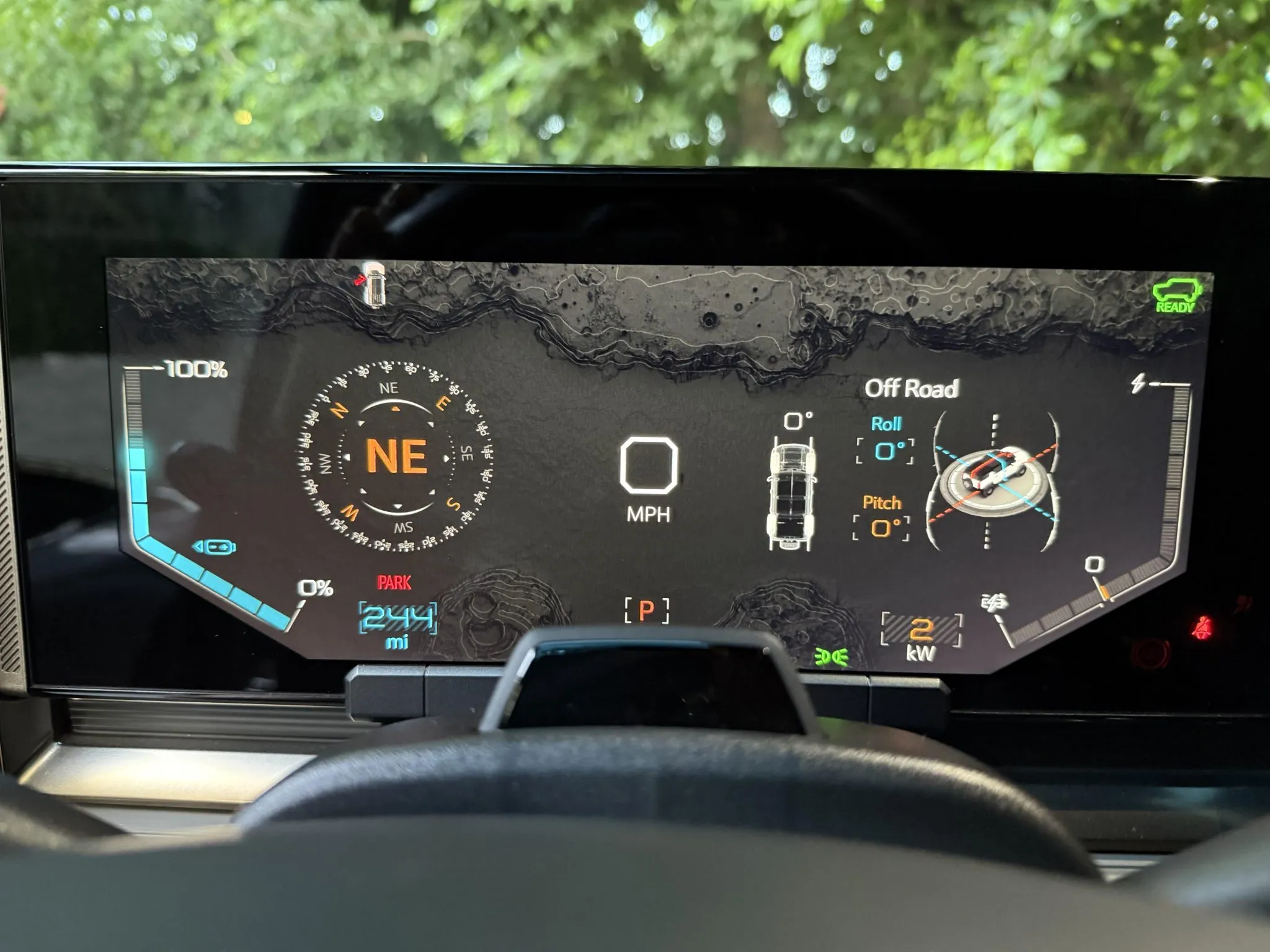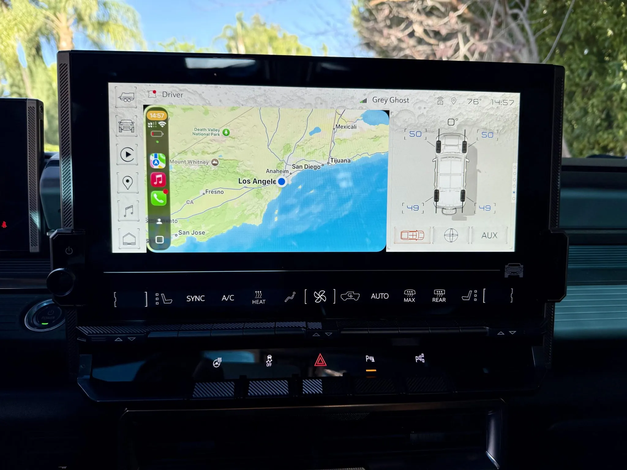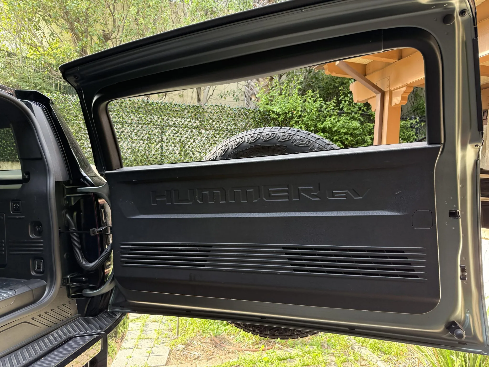 The 22″ eight Y-spoke alloy wheels are mounted with 305/55 Goodyear Wrangler Territory AT tires, and a matching spare is secured to the swing-out tailgate. The CrabWalk four-wheel steering system allows the rear wheels to turn up to 10°, enabling the truck to travel diagonally at low speeds. Additional features include regenerative braking and a four-wheel adaptive air suspension.