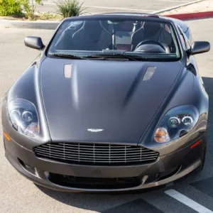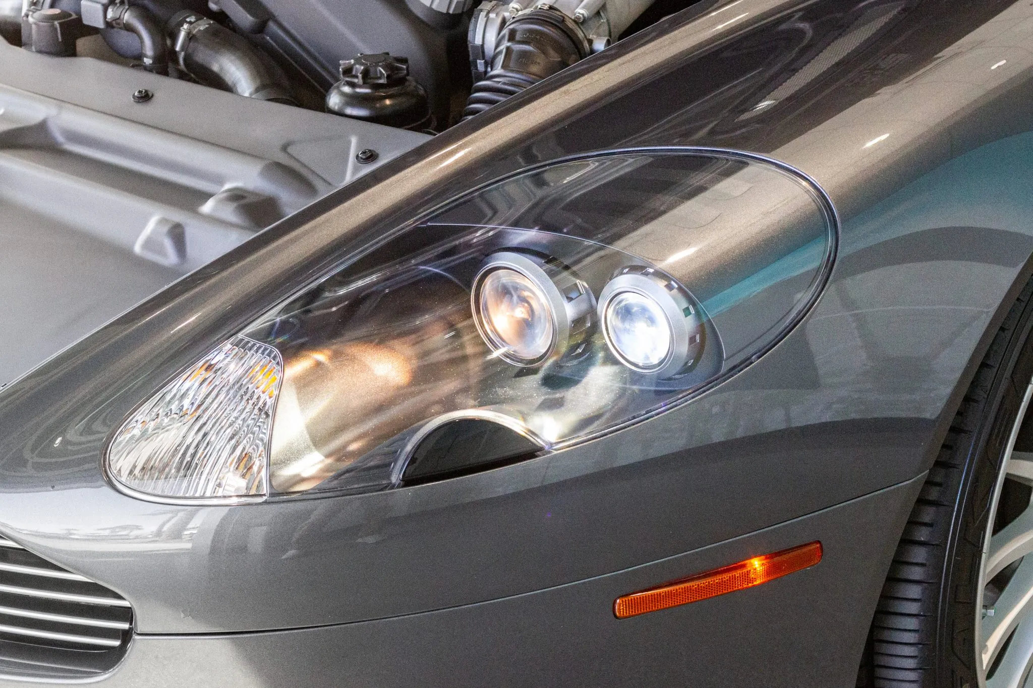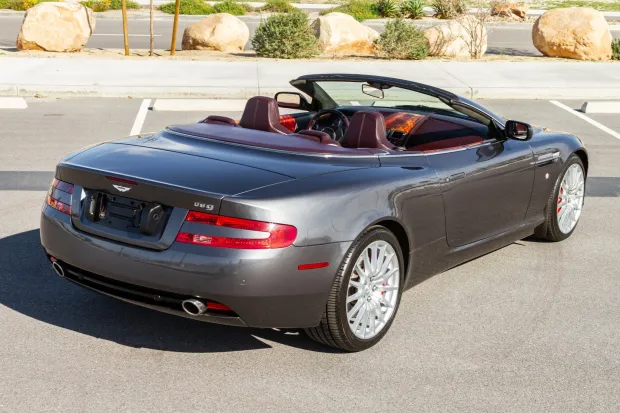 The DB9 featured a mix of aluminum and composite body panels installed over an extruded aluminum spaceframe. This example is finished in Meteorite Silver and features a power-operated black soft top, a Tungsten grille, hood vents, fender vents, rear parking sensors, LED taillights, and dual exhaust outlets.