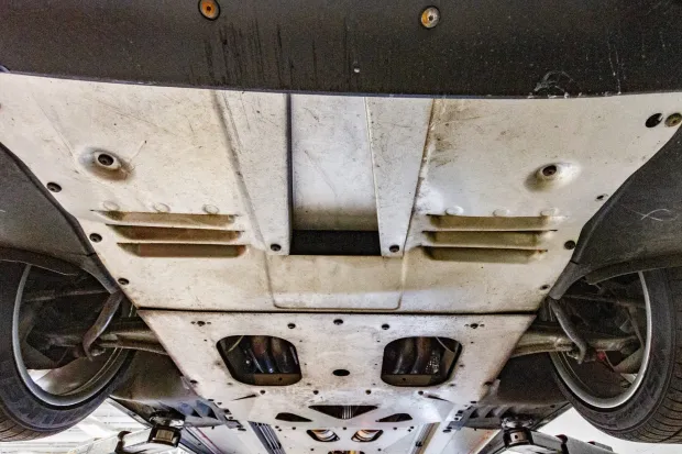 The 19″ 15-spoke alloy wheels were mounted with 235/40 front and 275/35 rear Falken Azenis FK460 A/S tires in September 2025. Braking is handled by red calipers over slotted and ventilated rotors at all four corners.
