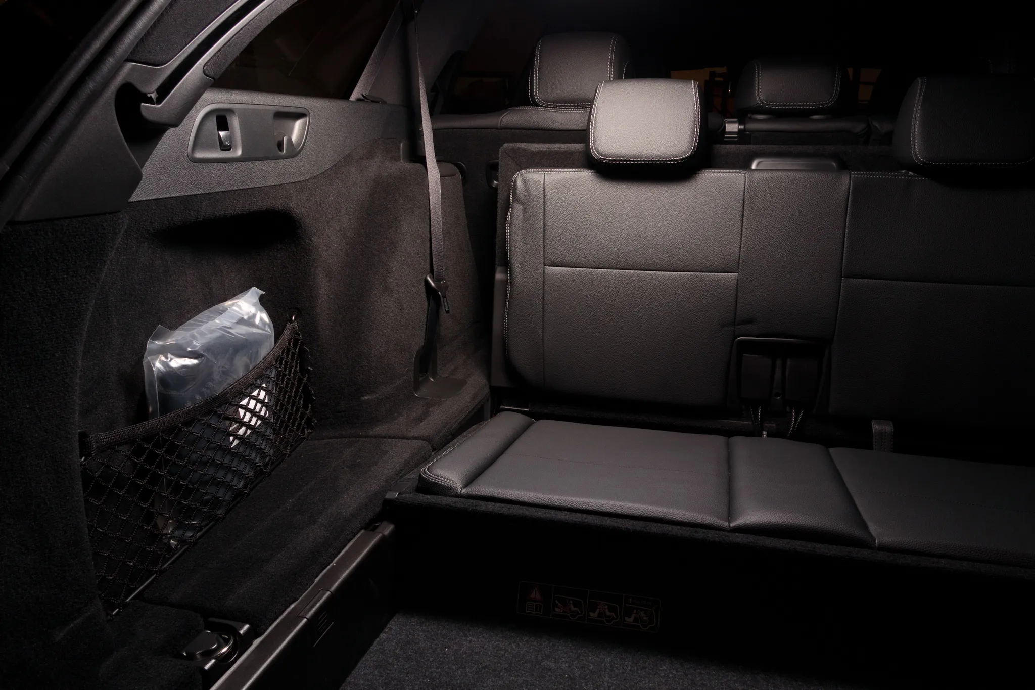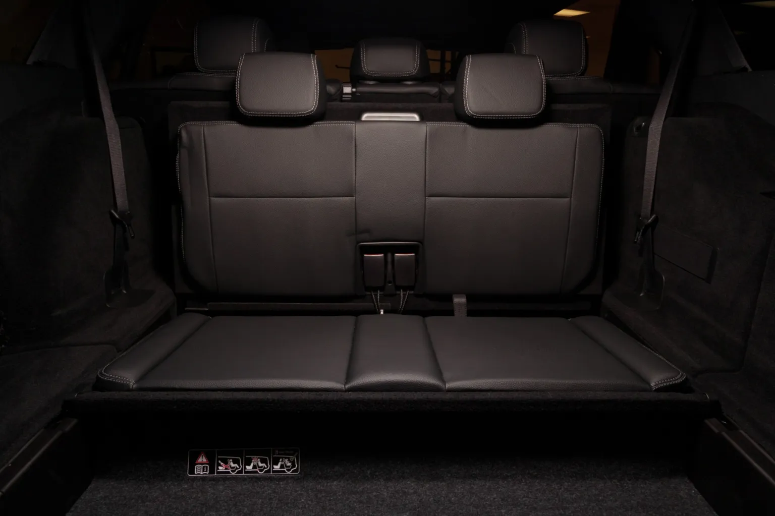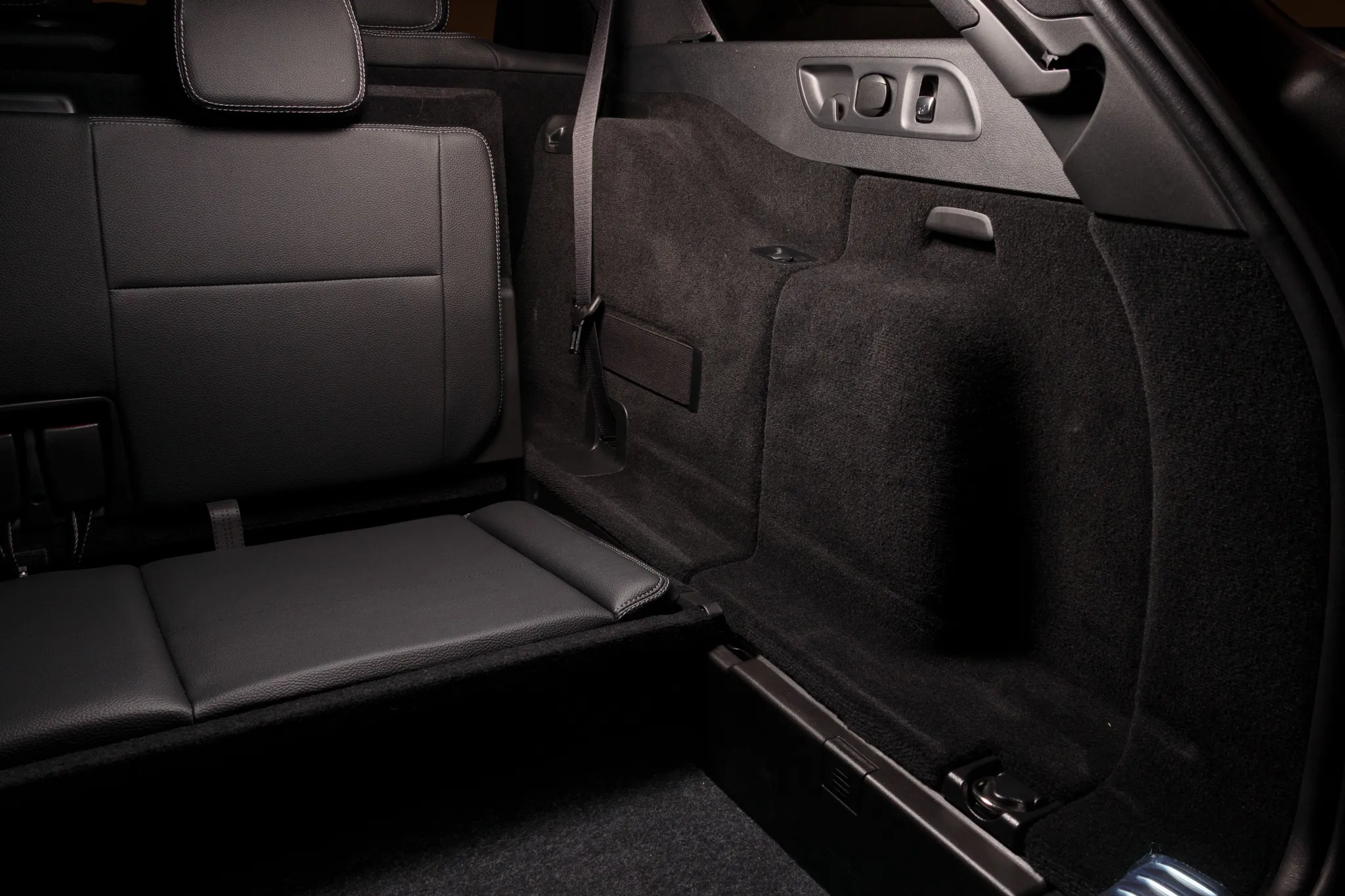 The cargo area features a rear-facing bench seat that folds flat into the floor.