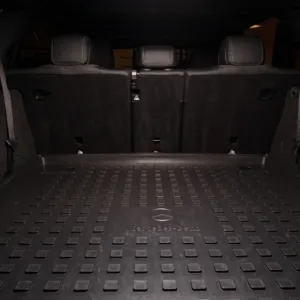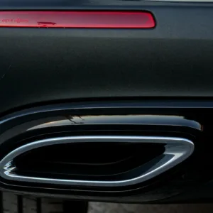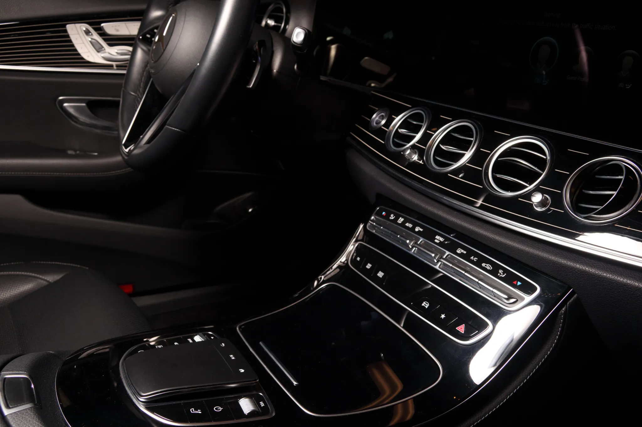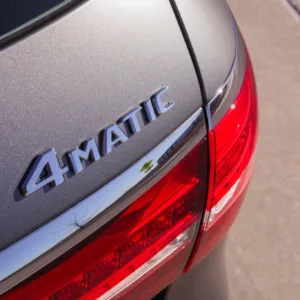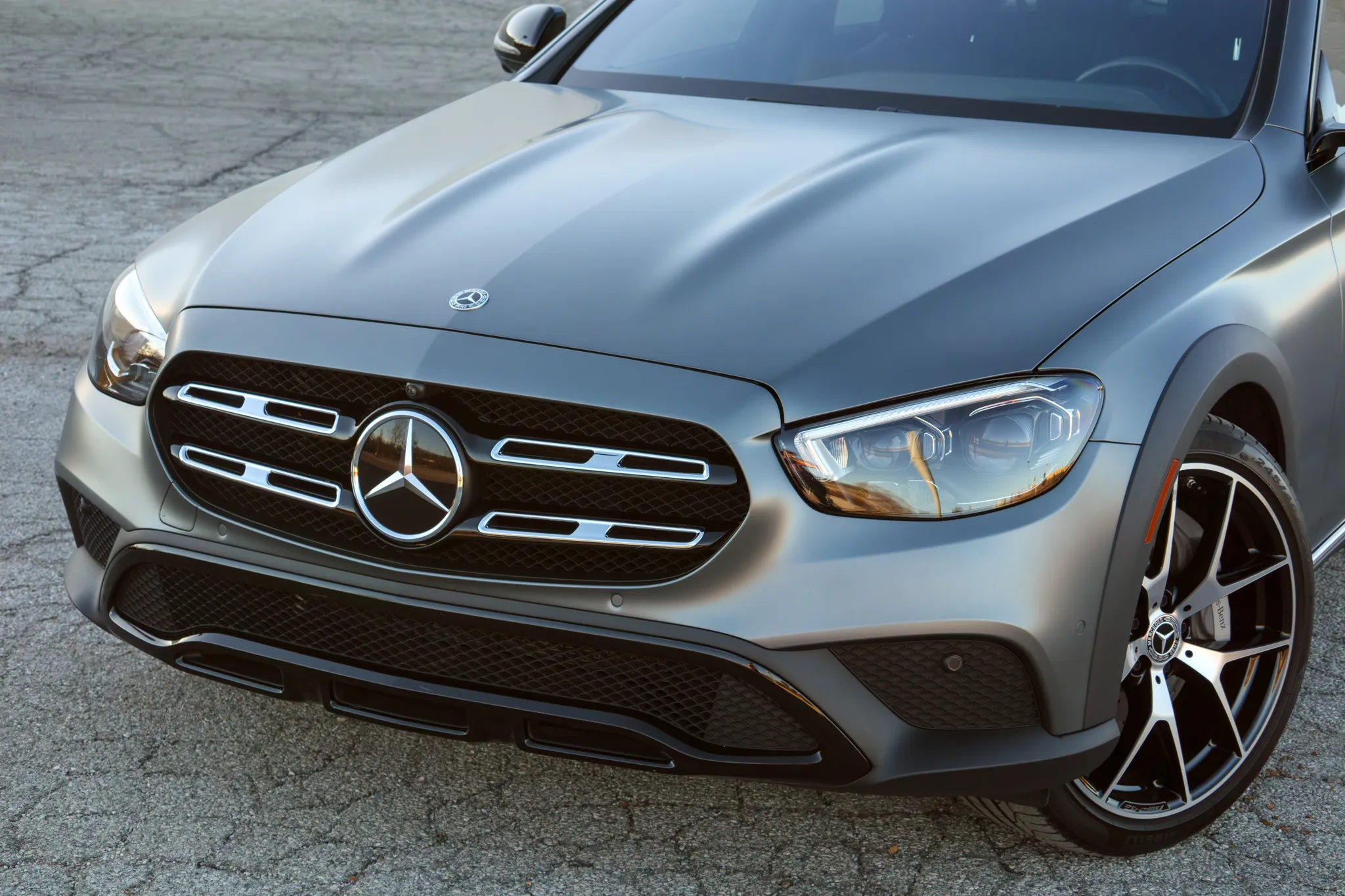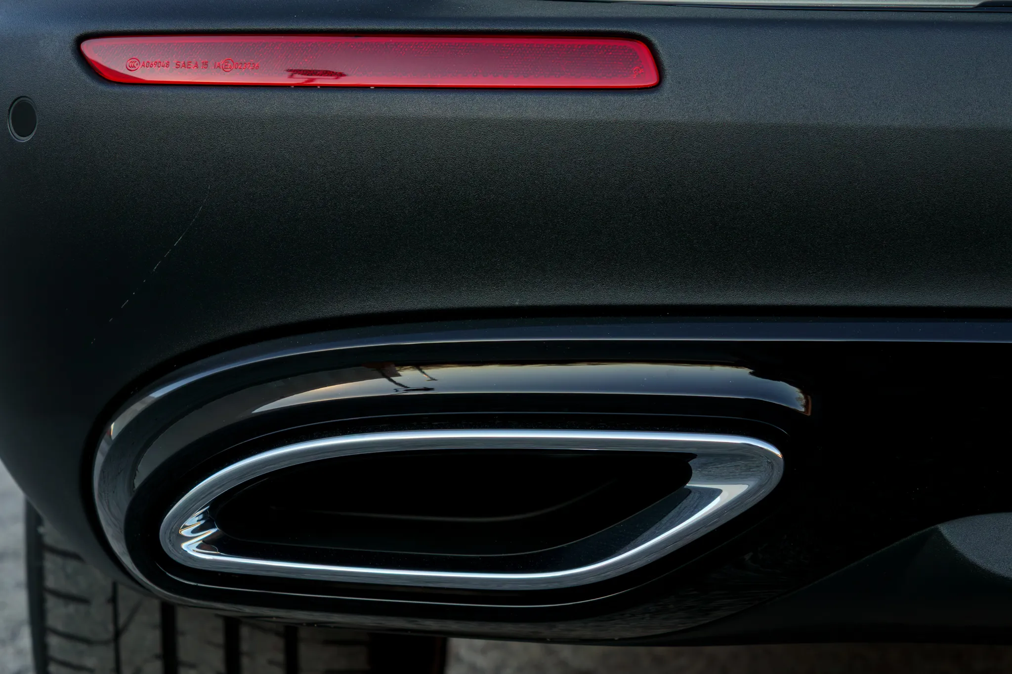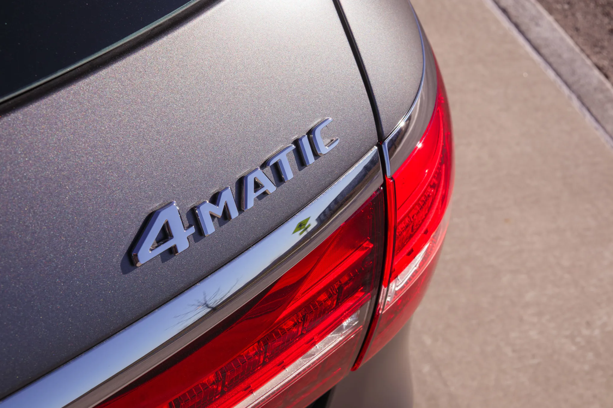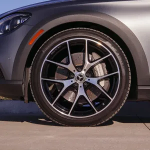 The 20″ AMG twin five-spoke wheels have black accents and are mounted with 245/40 front and 275/35 rear Pirelli P Zero tires. The car features a comfort-tuned suspension that includes a self-leveling air suspension system at the rear, with the All-Terrain wagon featuring an increased ride height compared to other S213 wagons. Stopping power is provided by four-wheel disc brakes with Mercedes-branded calipers over cross-drilled rotors up front.