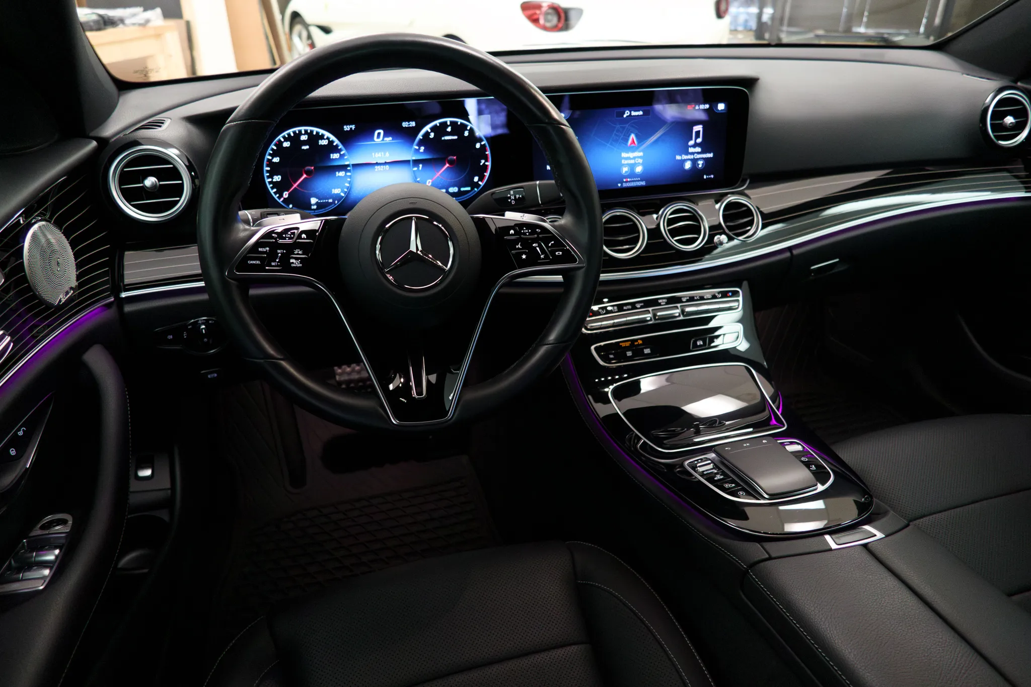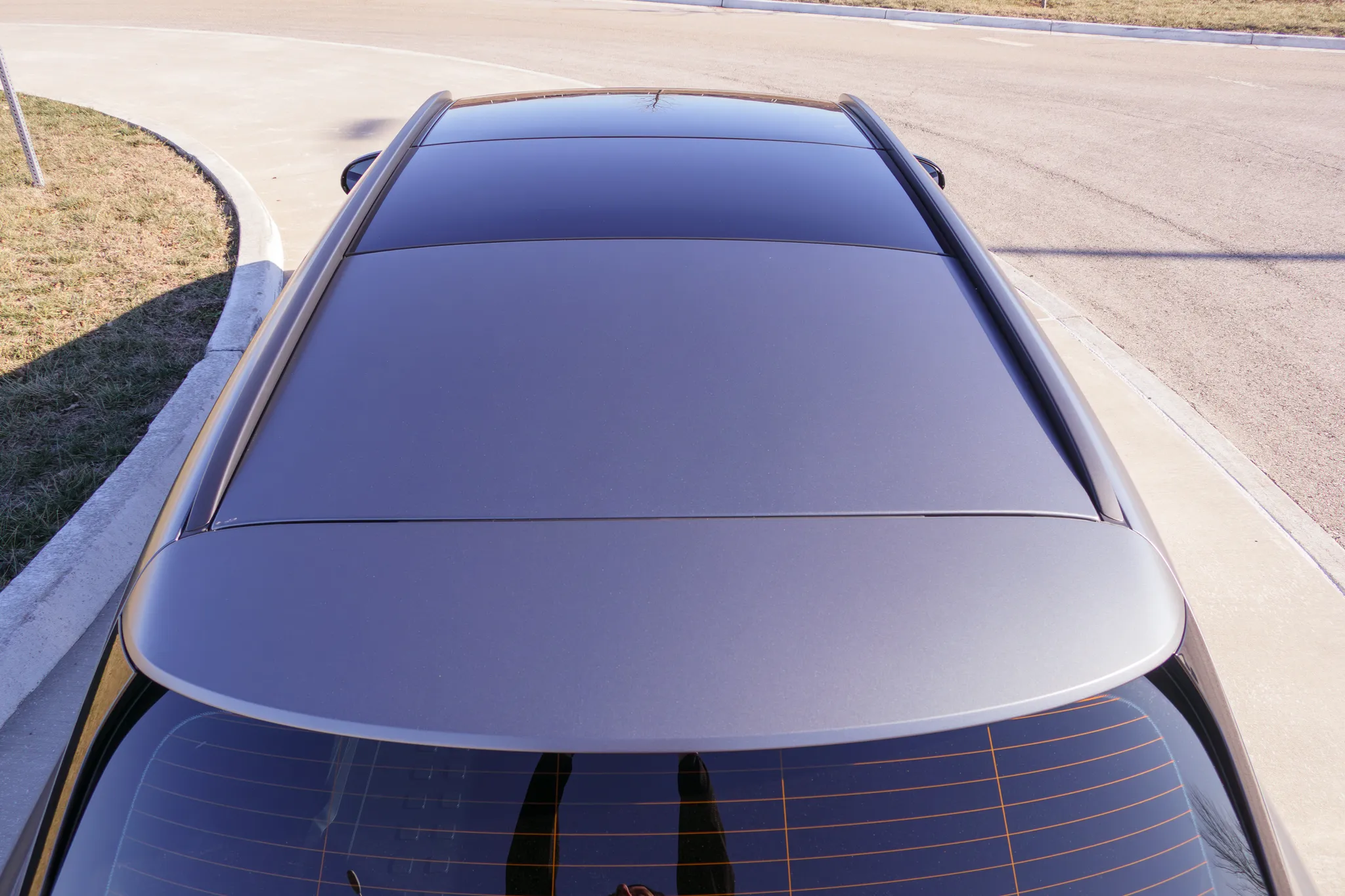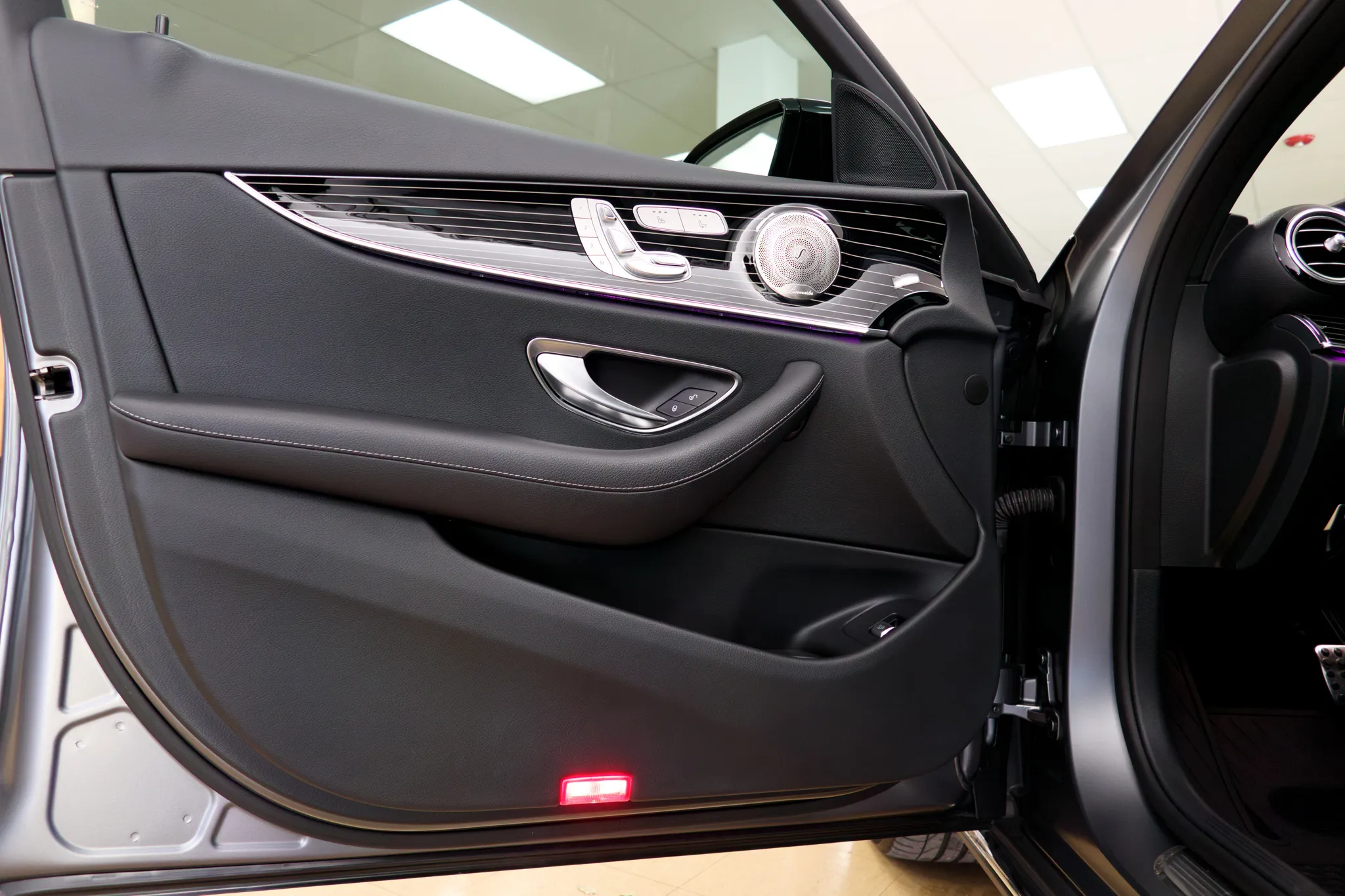 The car is finished in Designo Selenite Gray Magno (297) with high-gloss black accents on the grille, bumper covers, mirror caps, roof rails, and window trim as part of the Night Package. Further exterior appointments include a panoramic sunroof, the LED Intelligent Light System, Adaptive Highbeam Assist, Parktronic parking sensors, soft-close doors, LED logo projectors, noise-reducing laminated windshield and front-door glass, and window tint. The All-Terrain wagon featured extra lower cladding compared to standard S213 wagons. Paint-protection film has been applied to the front bumper cover.