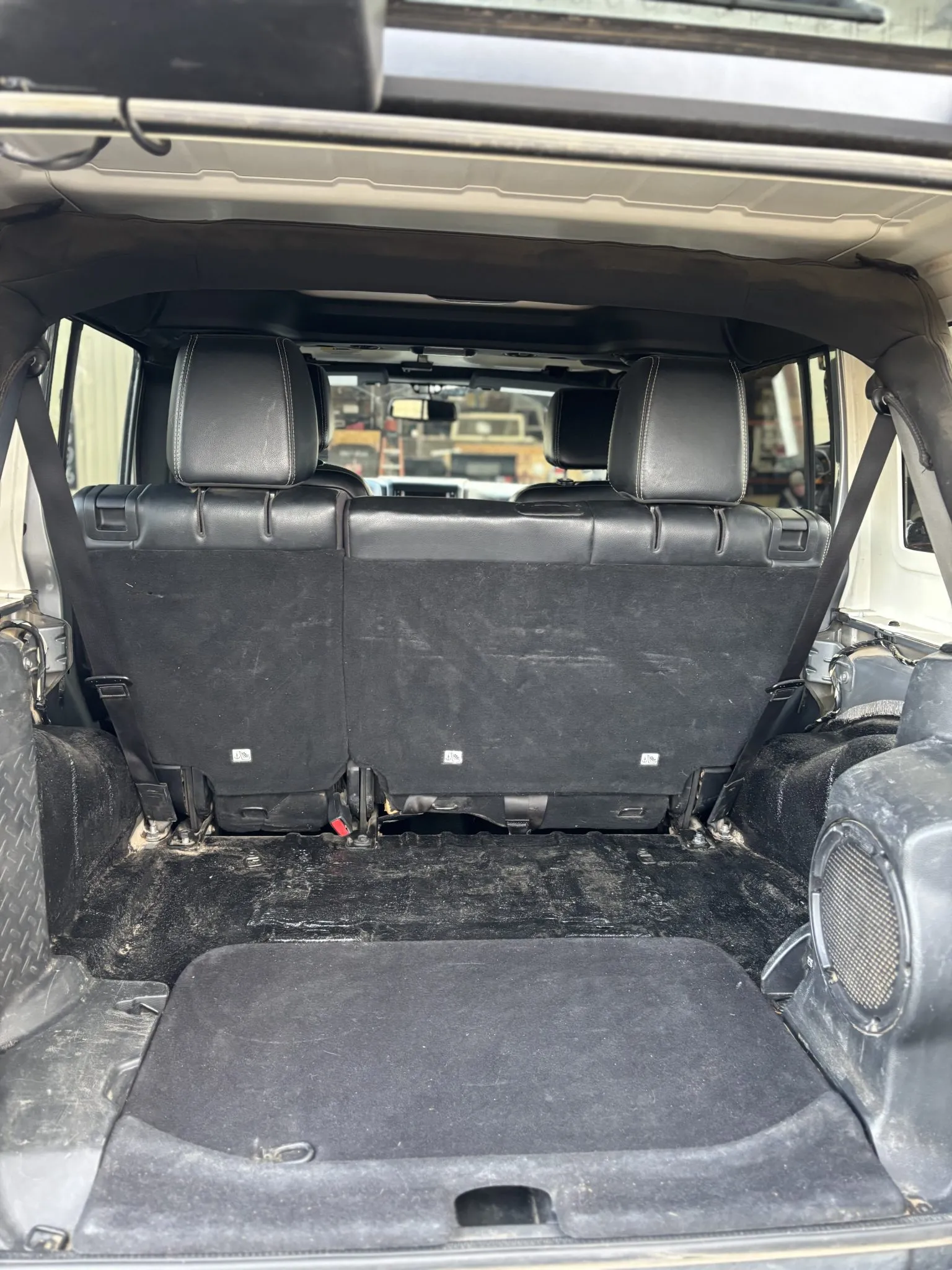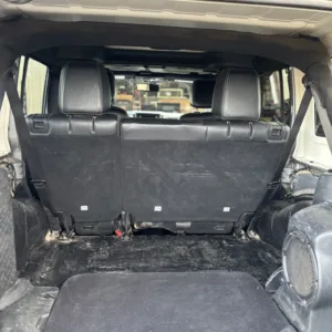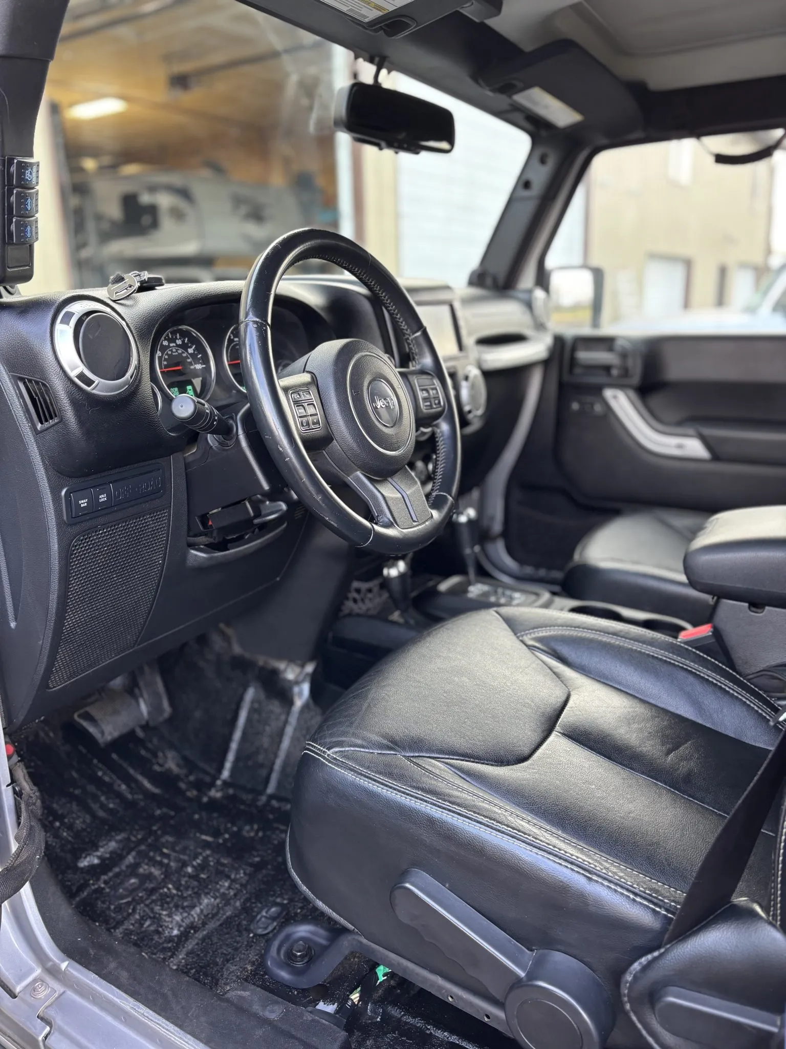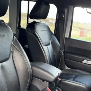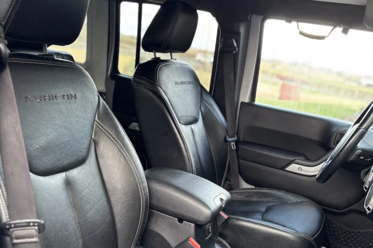 The heated front bucket seats, along with the split-folding rear bench, are upholstered in black leather. Additional appointments include air conditioning, cruise control, power windows and locks, a padded roll cage, an Alpine sound system, and a nonoperational Uconnect touchscreen infotainment system. The carpeting has been removed, ARB switchgear has been added to the left A-pillar, and seat-upholstery wear is depicted in the gallery.