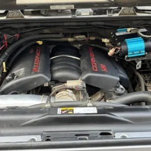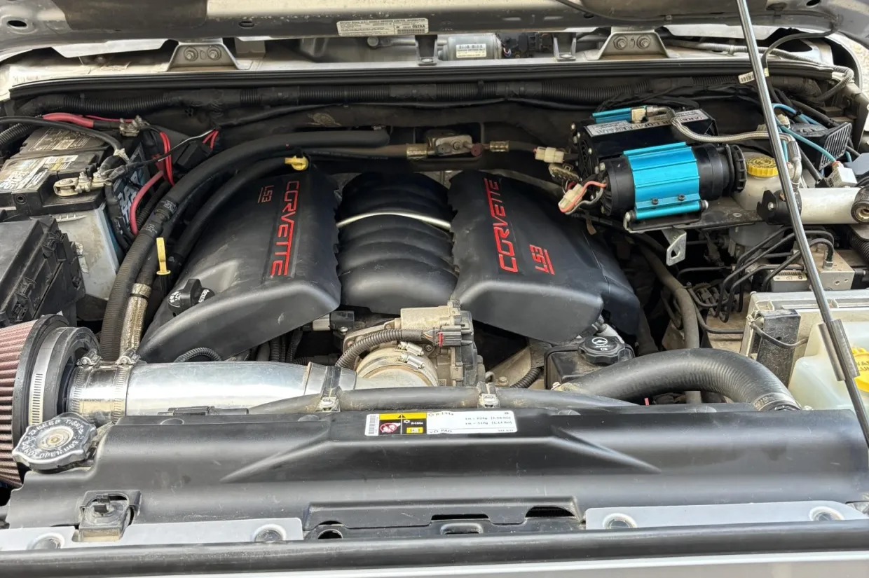 The 6.2-liter LS3 V8 was installed in 2016 utilizing a 450-horsepower Bruiser Conversions kit, and it is equipped with a K&N intake-air filter and Corvette-branded covers. An ARB compressor is secured in the engine compartment.