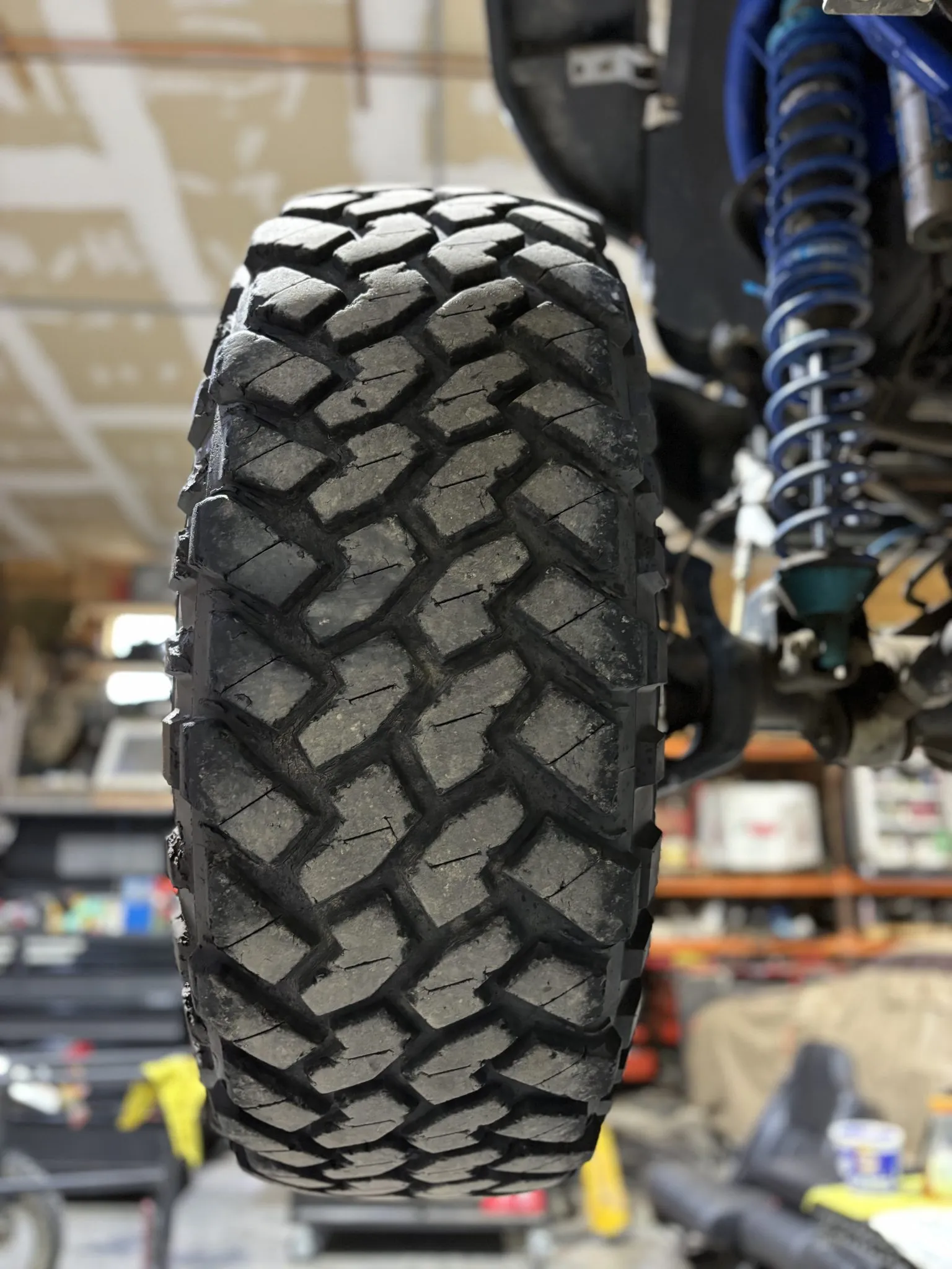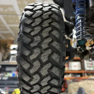 Black-finished 17” Vision 403 Tactical wheels are mounted with 40×13.50″ Nitto Trail Grappler M/T tires, and a spare on a KMC wheel is located at the rear. A Rebel Off Road suspension kit with King coilovers has been fitted, as have TeraFlex control arms, a Currie Currectlync steering system, and a Fox ATS steering stabilizer. Braking is handled by power-assisted four-wheel discs.